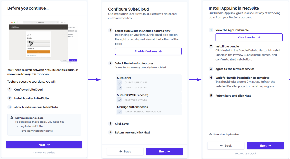 We have revised and improved the connectionConnection A link between a Codat company and a data source (like an accounting platform). Each connection represents authorized access to pull or push data from that platform. flows a small business customer goes through when connecting NetSuite, Sage Intacct, and QuickBooks Desktop. We have added: