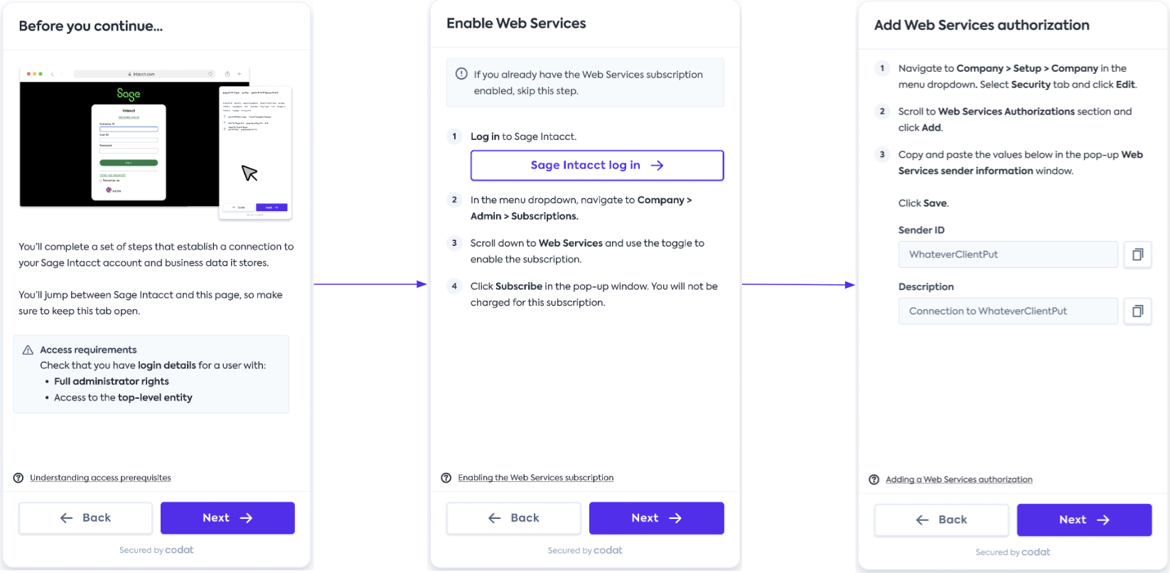 • It caters for both user-based and role-based Sage Intacct companyCompany In Codat, a company represents your customer's business entity. Companies can have multiple connections to different data sources. setups, adjusting the journey accordingly.